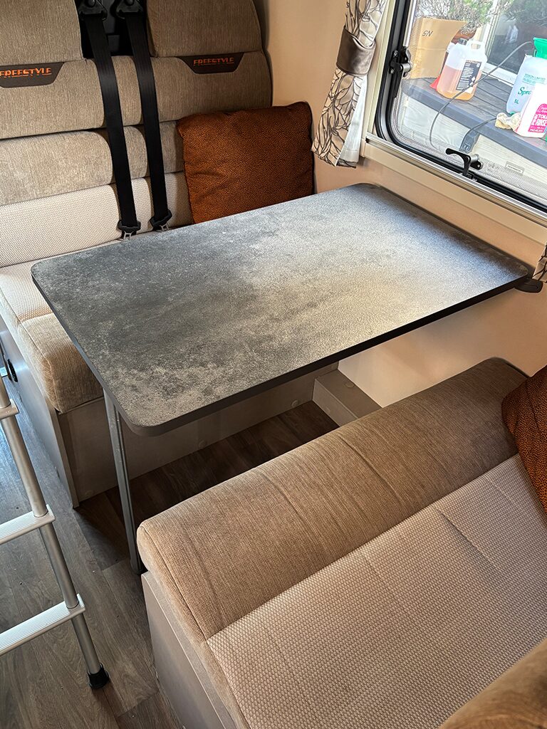 The table is adorned with tasteful plates, bowls, and cutlery, each piece carefully selected to complement the motorhome’s modern aesthetic. Every element reflects refinement and care, inviting diners to enjoy their meals in an ambience of understated luxury.